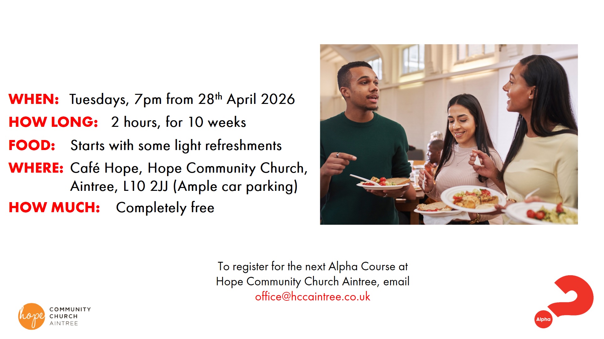 Our next Alpha course is scheduled to start in April 2026. To register your interest in the next Alpha course, please contact the office